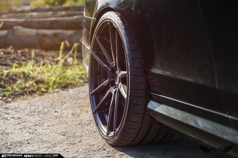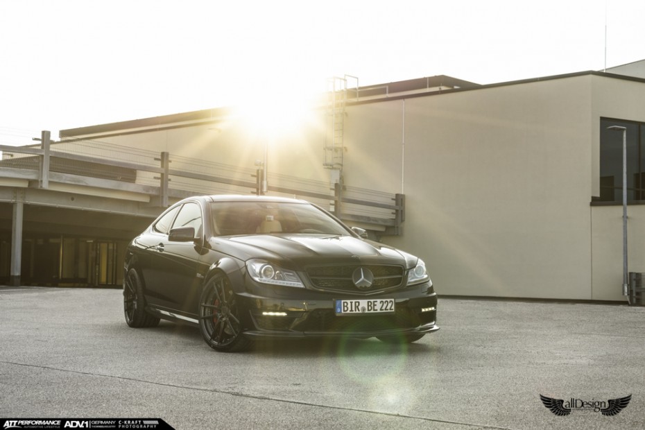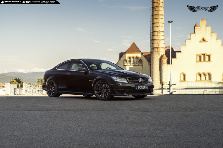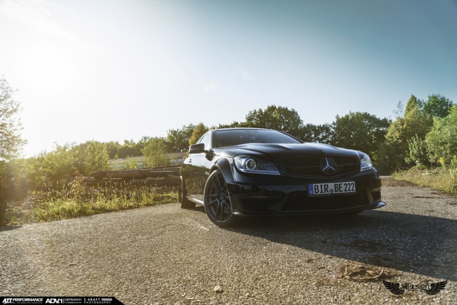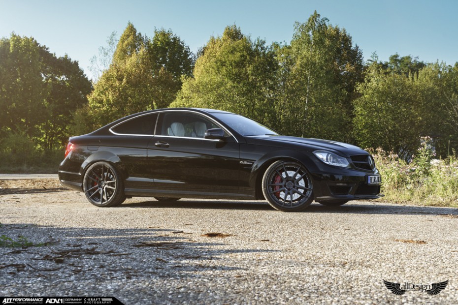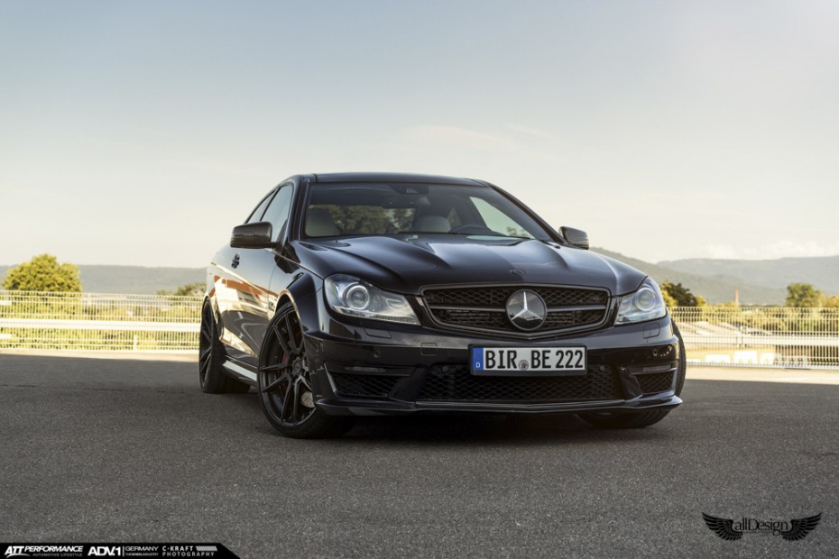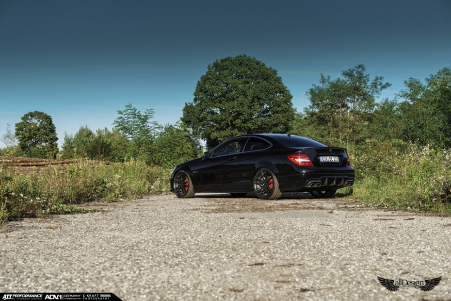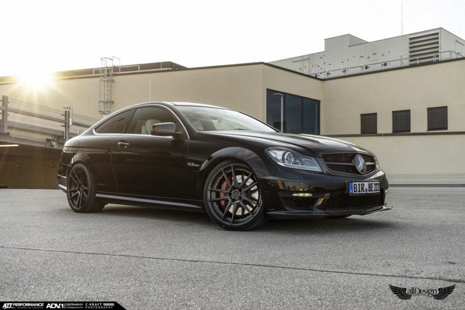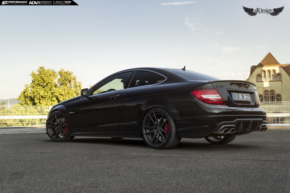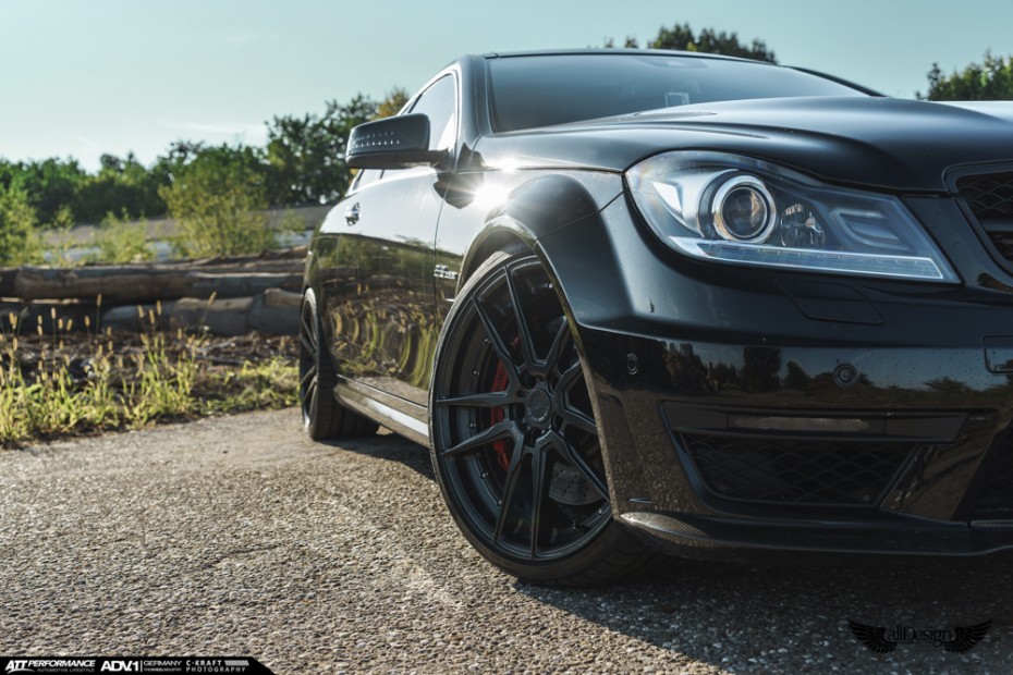Espectacular Mercedes C63 AMG Coupe (W204) negro equipado con llantas forjadas a medida de la americana ADV.1 Wheels, en diseño y configuración ADV5.2 M.V2 Competition Spec y color negro mate.
