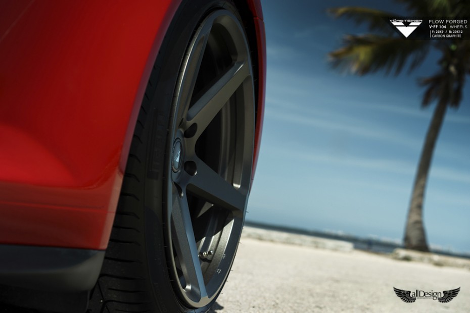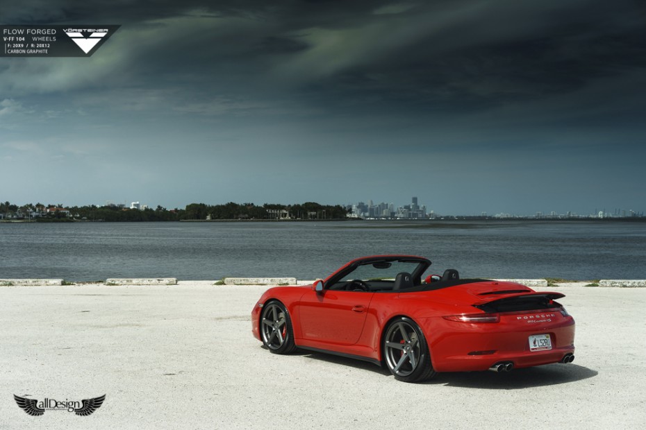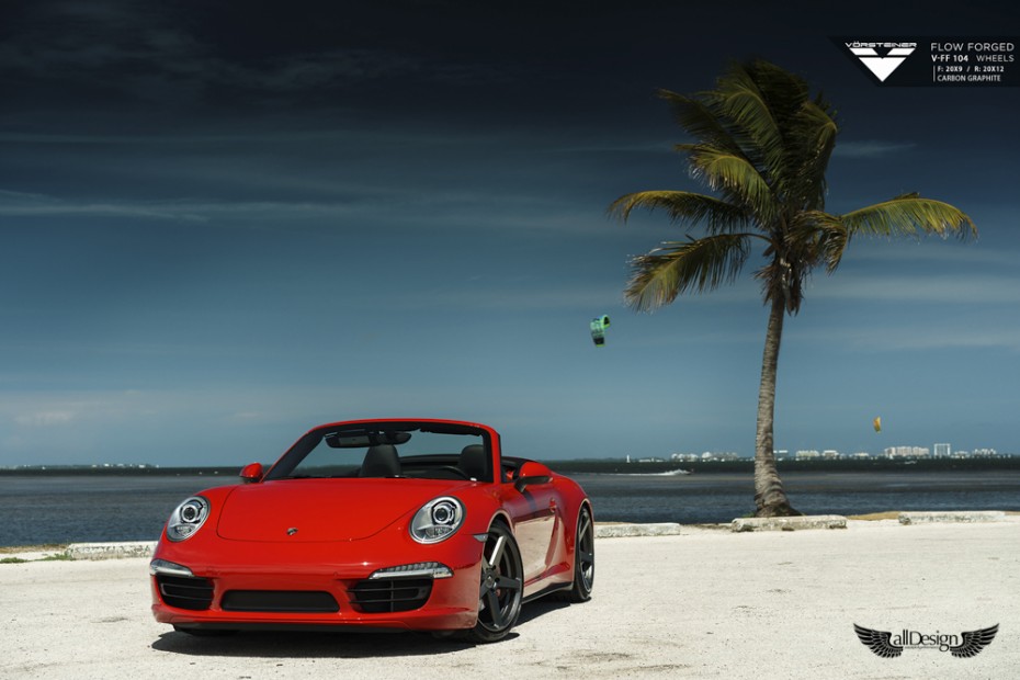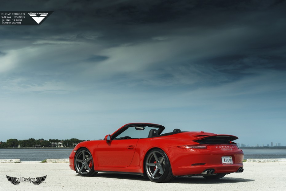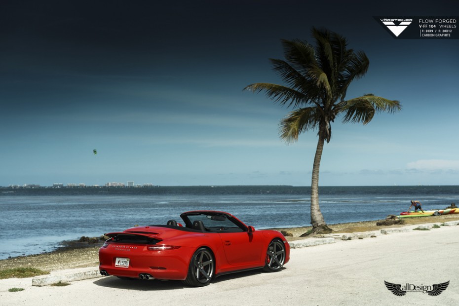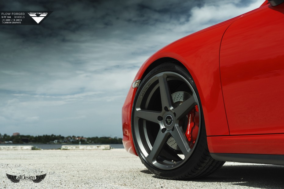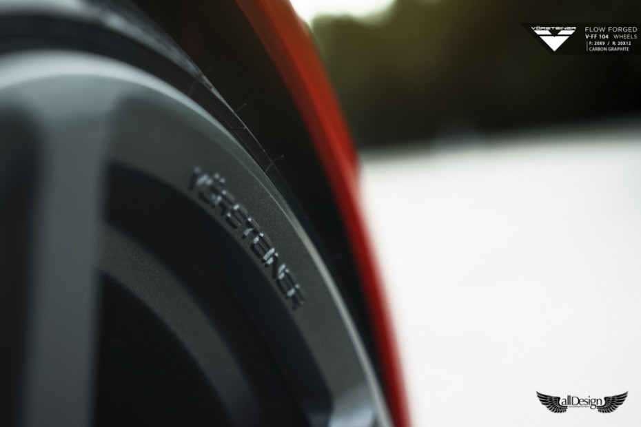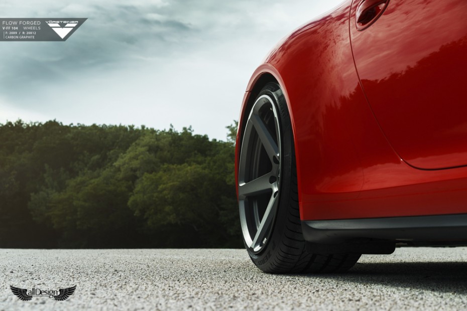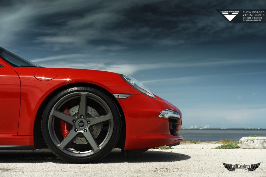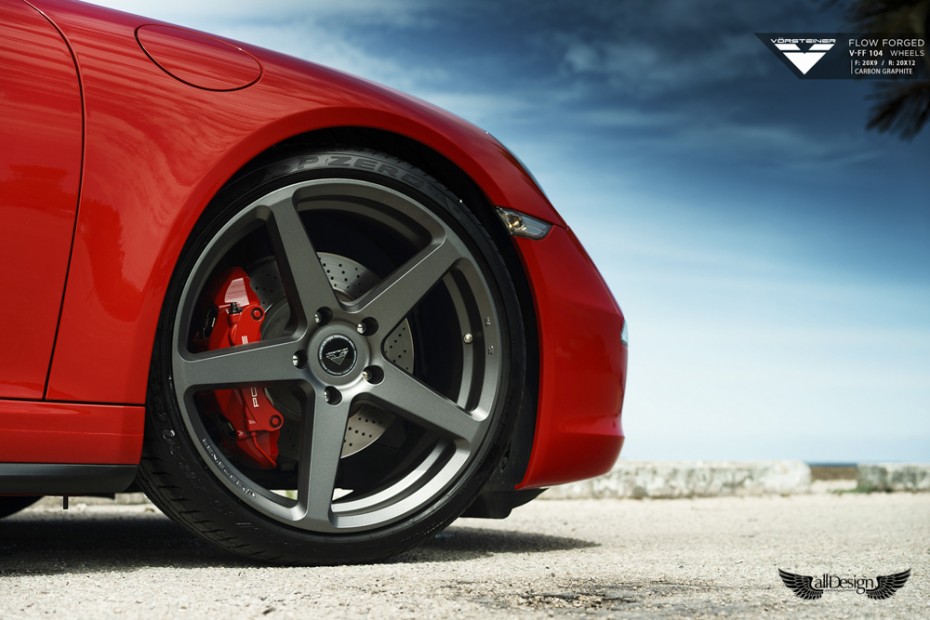 Este precioso Porsche 911 Carrera 4S (991) rojo equipa un nuevo set de llantas Vorsteiner V-FF 104 Flow Forged de 5 radios, cuerpo cóncavo, y doble medida, en 20×9 pulgadas en el eje delantero y 20×12 pulgadas en el eje trasero.